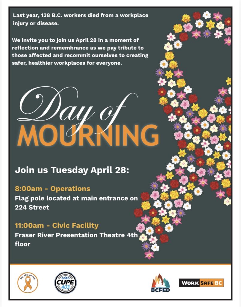 Day of Mourning – Tuesday April 28, 2026 Each year, on April 28, we come together across British Columbia to recognize the National Day of Mourning— a time to honour workers who have been injured, made ill, or lost their lives due to workplace accidents.